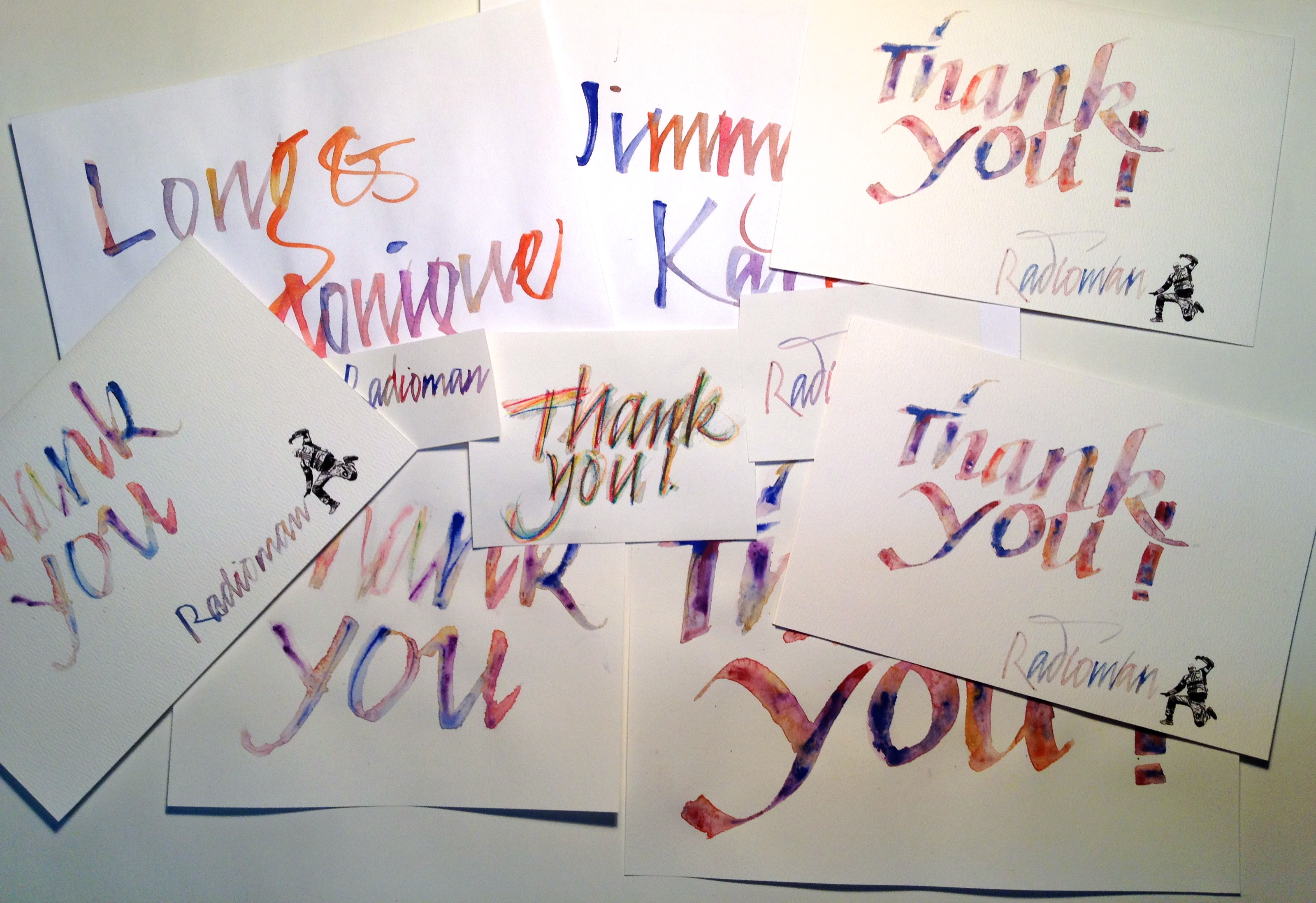 Mark is a very talented guy and has a good aesthetic sense, but isn’t skilled at creating visual art. So I wrote out a few versions of the simple message of Thank You and he reviewed them and then picked three.