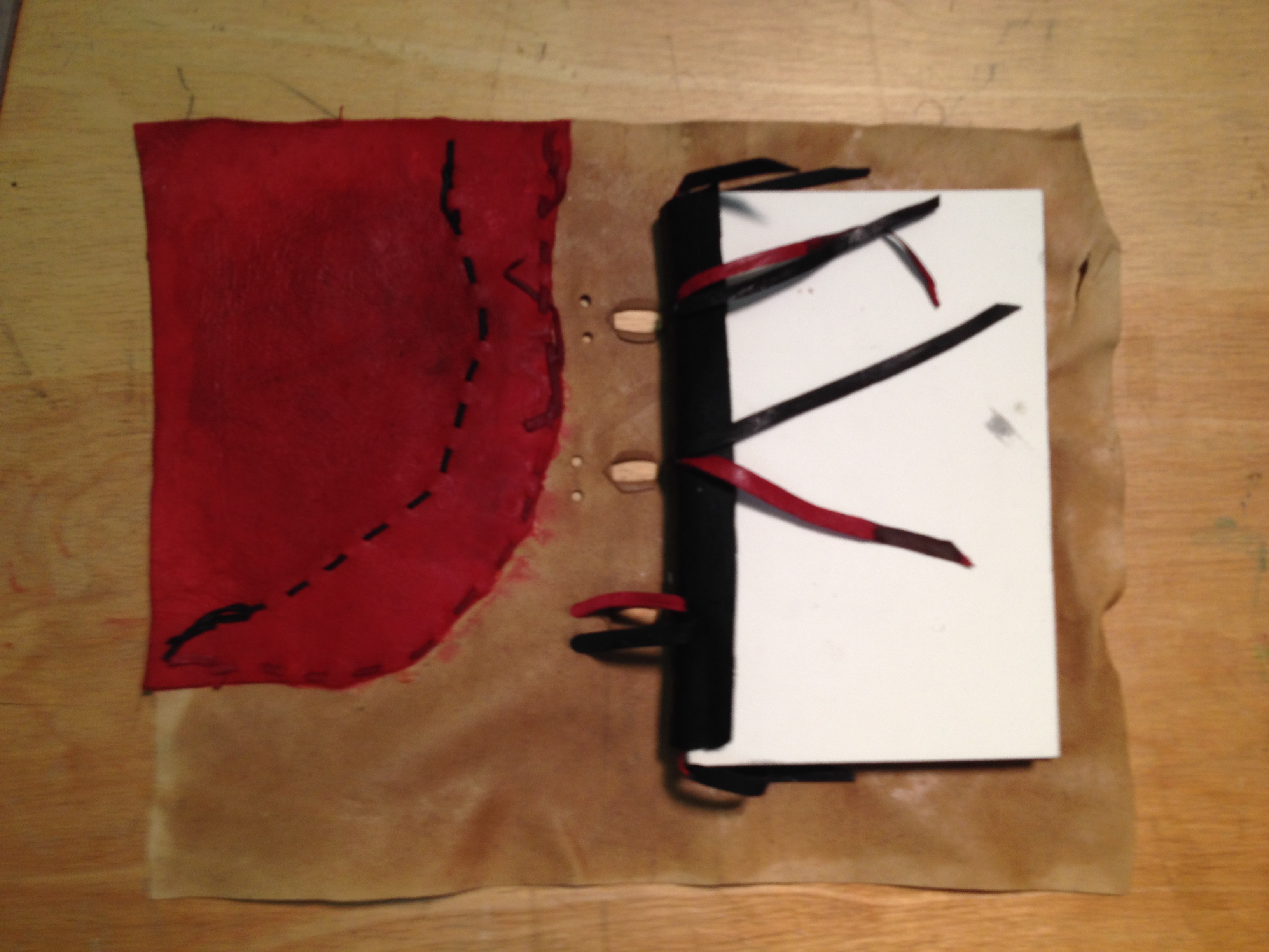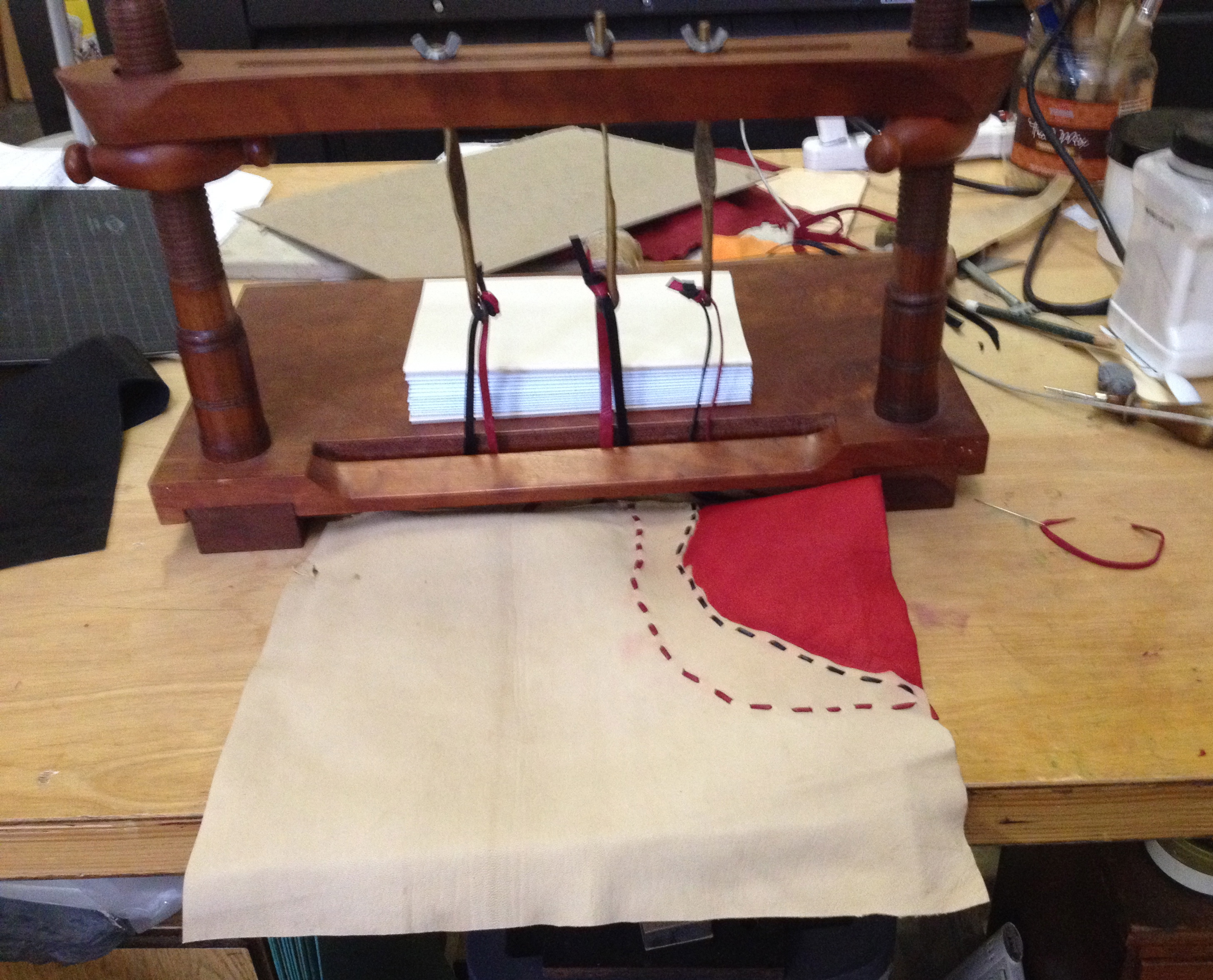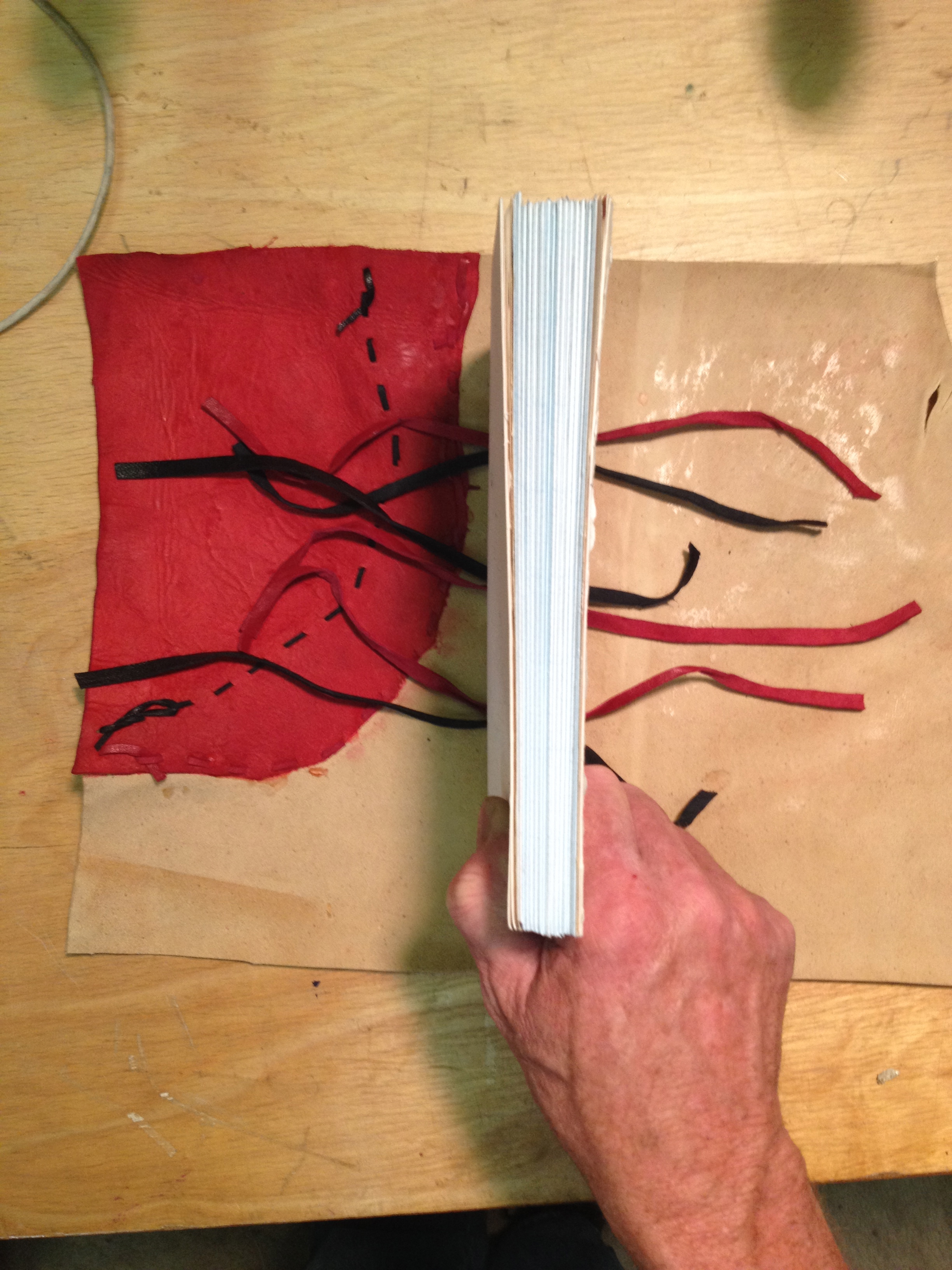 The Ouroboros process continues. Thongs pulled through to outside cover, ready for lacing.