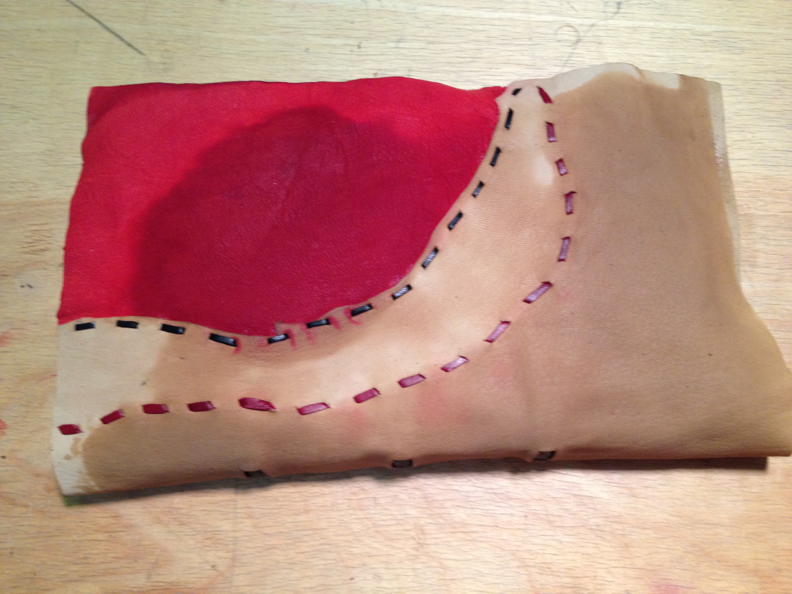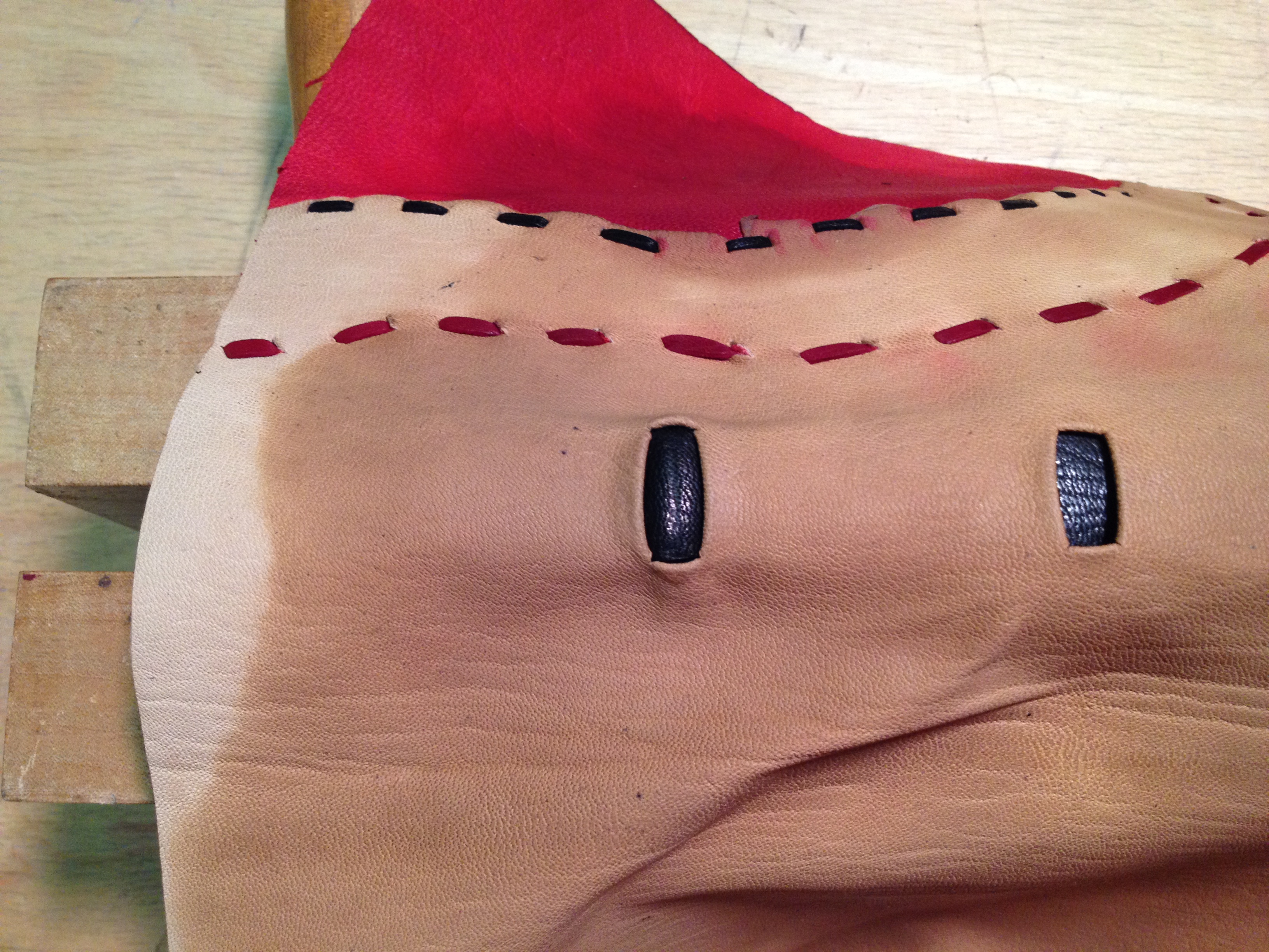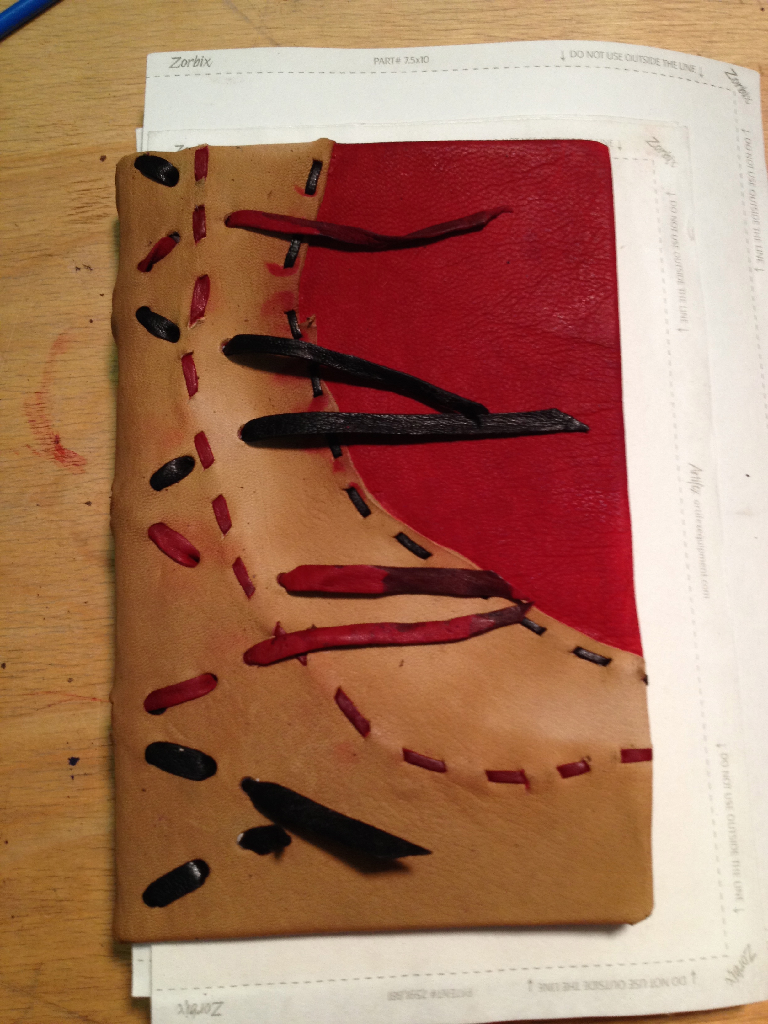 The Ouroboros process continues. Thongs pulled through to outside cover, ready for lacing.