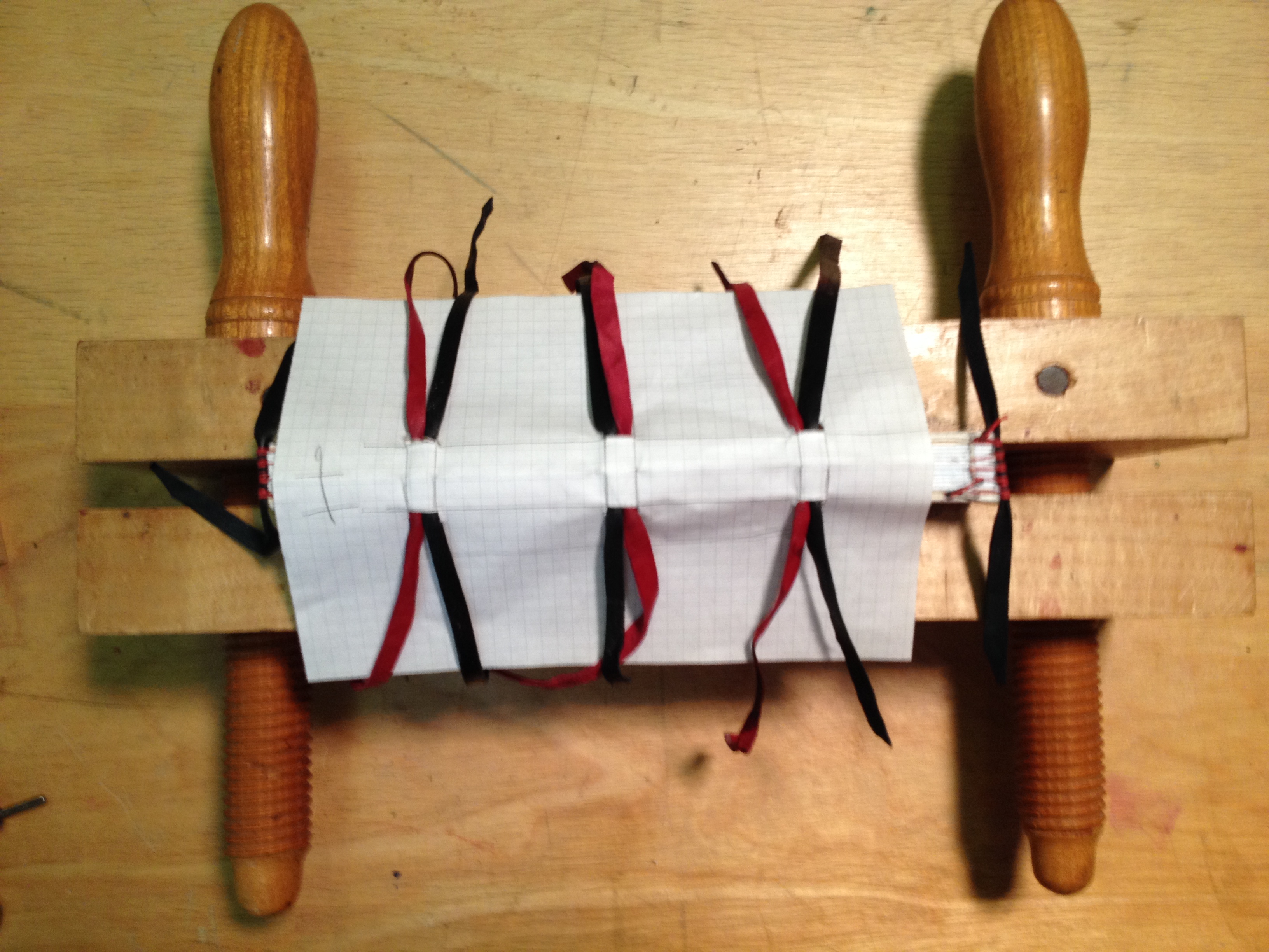 I’ll be teaching a class on making Girdle Books at SFCB beginning next Saturday, January 25, 2014. It’s a series of 5 Saturdays where students will fold paper, sew text blocks onto cords, then cut and shape quarter-sawn oak boards and lace them onto the text block. Covering in leather with a long “tail” that is tied into a turk’s head knot allows the reader to carry the book hanging from their belt – or girdle as it was called then. The students will shape the wood, drill it and lace on cords and after covering they will work metal for clasps.