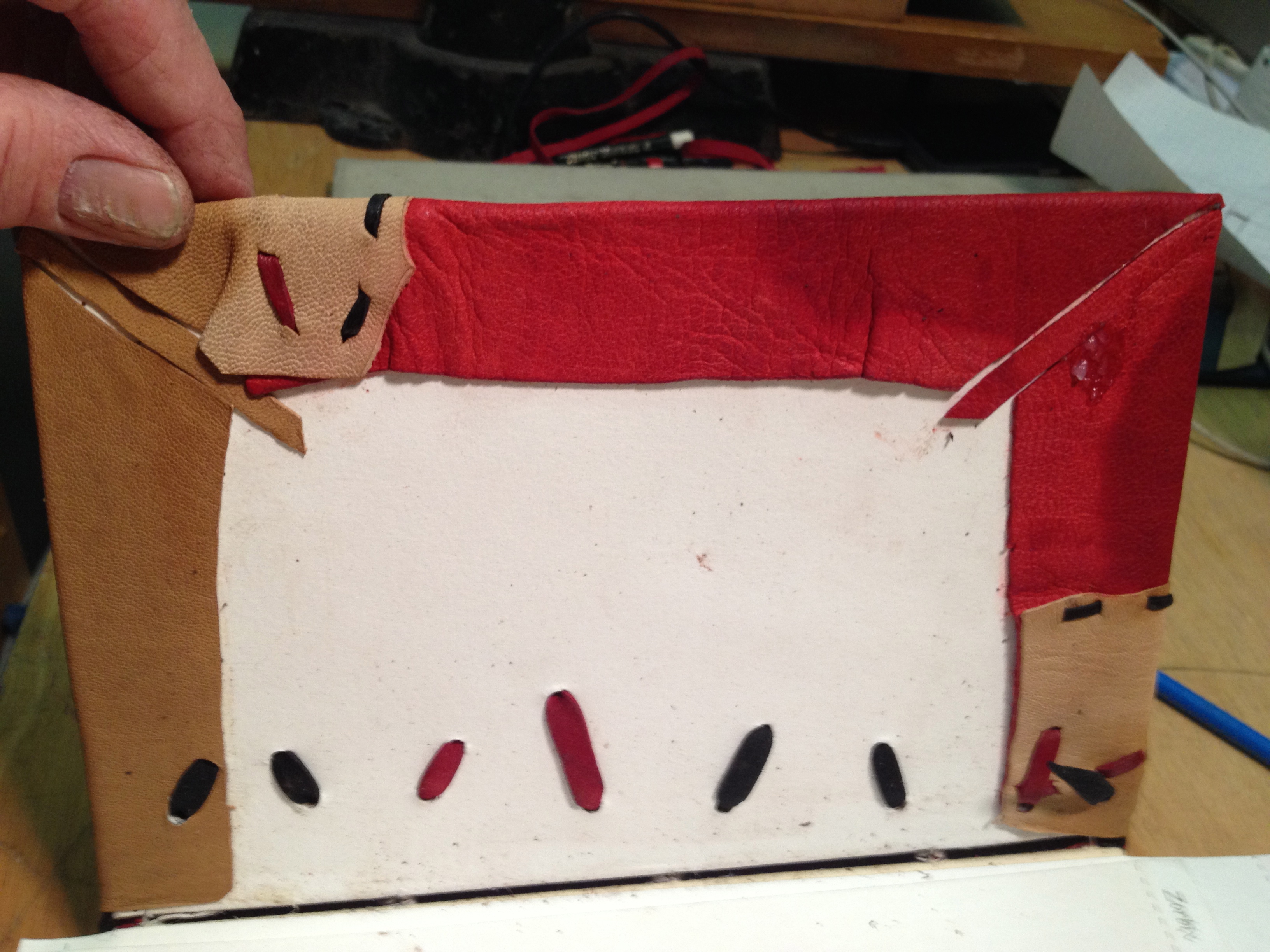 Cartonnage showing laced thongs prior to pasting up endpapers