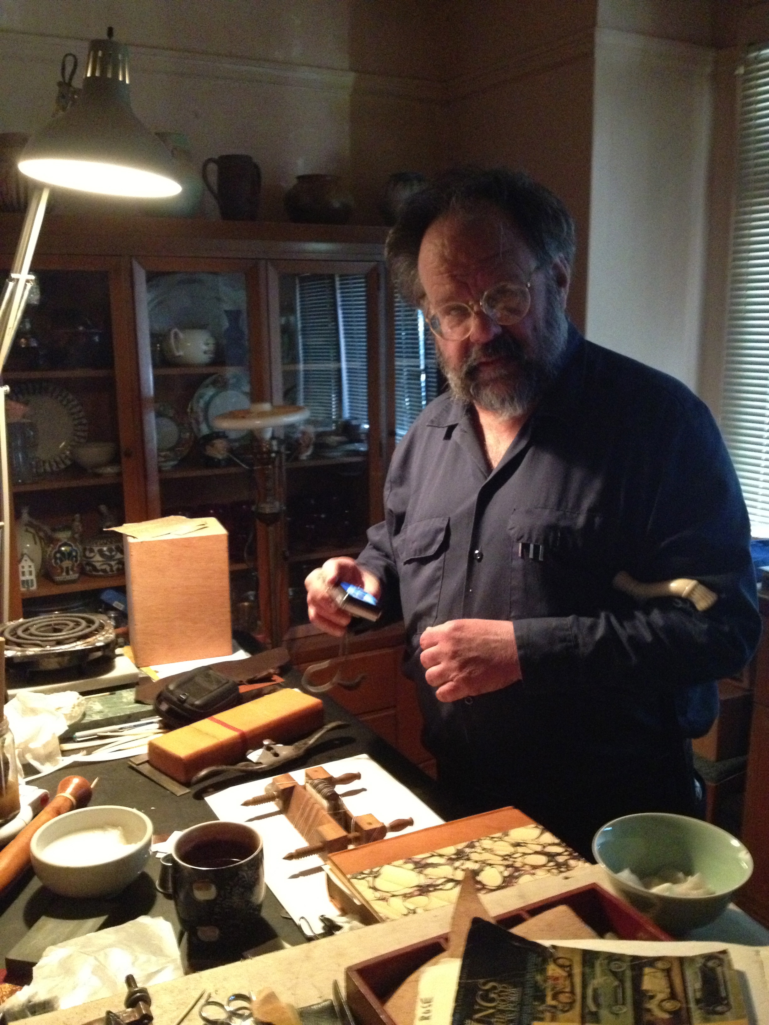 While we talked, Tom moved around and laid things out – he’s still working on that miniature bible and had covered it in leather. He tied it up in the miniature press and was taking pictures as we spoke.